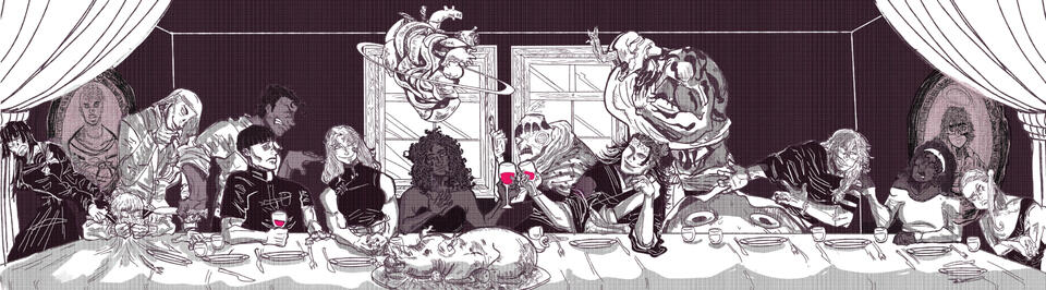 The thoughts were never-ending, buzzing through his mind with such speed and frequency they began to resemble the hum of a bee. They were difficult to decipher, overwhelming. They dizzied him. The only thing that granted him any semblance of peace of mind was that tomorrow would be the end to these thoughts. No more of this sinking feeling in the pit of his stomach, no more dread. Just an eternal dreamless sleep.As much as he tried not to overthink his plans, he continously found himself having to rein in his ruminations. He wanted to focus on the dinner, on the conversations all around him. He hadn't seen some of these people in years. And, in a circumstance of bittersweet irony, this would be the last he'd see of them.Had he even missed them?His heart ached in his chest."You seem distracted."Dominic jolted up in his seat, looking to the source of the voice. He met eyes with Yuki, who had called out to him from where she sat beside Tabitha across the table from him. She looked smug, aerating her glass of wine in one hand and resting her other hand delicately over Tabitha's.His apology was stuck in his throat. He was sick of of speaking the damned words. Only a foul taste in his mouth remained every time they rattled out of him. However, this left him with nothing to offer her but a cold stare in response."Oh my! What did I do to deserve such a scary look, Dom?" Yuki chirped."That little look of his brings back so many fond memories."He heard Tabitha's voice but he couldn't bring himself to look at her. He lowered his head."Oh? Like what?" Yuki asked, but the rest of conversation fell to murmurs.Beside him, Roger took hold of Dominic's hand and squeezed. "You don't look so good, pretty boy. Maybe you'll feel better once you eat." He spoke softly, his words falling over Dominic like a warm blanket. "When was the last time you ate something?""I don't remember," Dominic mumbled."Hey! That's not good!" Roger scolded, moving his hand up to the priest's shoulder in attempts to get him to look up at him. "Please, eat. I cooked this meal with Tabi and you in my heart." Despite his worry, he wore a tender smile on his lips.It was as Dominic reached a shaky hand towards his fork that Tabitha spoke to him. A hush fell over the table at the question, all eyes shifted towards him - varying degrees of interest and animosity reflected in them. Even Roger seemed to shrink away from him. The decision to stay behind in Jujutsu Tech all those years ago came crashing down onto his shoulders."How's Satoru, Dominic?""He-""Look at me when you're talking to me."First, his eyes went to Roger, searching for reassurance - but he found none. The other man had turned away from him, fiddling with his own cutlery. Of course there would be no comfort to find there. He had been the one that had turned his back to them in the first place, and for what? What had he made of himself after all this time?Nothing. He remained the dog of Jujutsu Tech, with Satoru Gojo tightly gripping the leash around his throat.Finally, he looked towards Tabitha. His cheeks filled with color as he met her gaze. Her eyes penetrated him, wrapped around his heart and squeezed tight. It was hard to breathe.The words came out all at once. "You're not going to ask about Jasper?" He felt disconnected from his body, dissociative. It was suddenly very difficult to move, like a talking doll with dying batteries. Her presence was smothering. He sensed Roger risk a glance his way. Was he surprised at his callousness? Mortified?Something changed in Tabitha's expression. It sent chills down his spine. Her lips twitched, words dying as quickly as they formed on them.A voice came from the other end of the table. "We're all certain you've been looking after our beloved lamb with the utmost care and attention." Suguru sat in the chair opposite to Tabitha. Jogo and Mahito sitting on either side of him, one guarded and the other entertained. "Since you brought them up, is there something you feel you need to share about them?""They're doing another paternity test on them," Dominic responded immediately. He glanced towards Yuki, who was taking a snide drink from her glass. "Ms. Tsukumo's destruction of the clinic could only stall such a matter for so long." He paused, contemplating his words. "Why burn down the clinic in the first place? Are you afraid of the school finding out that you're their mother? Or ... is there something else you're hiding?" He looked back to Tabitha again, this time with resolve.Tabitha snorted and rolled her eyes. "They already know Jasper is my child," she replied with a nonchalant gesture over to the woman to her left. "Yuki told them this after informing them she torched the clinic under my orders. The paternity test is them coming up with tangible proof of my relationship to them to provide the others in the school without revealing Yuki is acting as a double agent."Dominic's expression twisted up into a look of confusion. "You know she's working for them?" he asked."Of course I do. I know everything," Tabitha smiled.Yuki leaned forward in her seat. "I'm playing double-double agent, dummy!" she chastized before downing the rest of her wine. "I thought you were smarter than this, Dom. How disappointing." She tsked, shaking her head in a show of disapproval.Dominic scrutinized both women before simply downcasting his gaze, hands rubbing at his temples in an attempt to tame the headache blossoming at the back of his head."Jogo's got a question!" Mahito's sudden shout drew everyone's attention. To his left, Dagon was using their tentacles to pick at the crunchier bits of pork off their plate, guiding the meaty pieces into their mouth below them. "He was just telling us all about it down in the bunker!"Jogo looked up from inspecting his own meal before him, alarm morphing into irritation. "Wha-" He started to argue but Mahito promptly cut him off."Remember! You were saying this was all one big waste of time!" Mahito's volume didn't drop, 