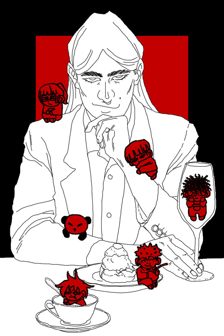 "They're humans! Even worse, Sorcerers! How could we be working with them?!""It's a temporary arrangement.""This is likely a trap! You're being foolish enough to prance right into their hands; and to risk everything by bringing all of us along with you? You're not taking this seriously at all.""Believe me when I say they have far more to lose than I do if they were to betray us.""But-""They are not associated with Jujutsu Tech and haven't been in decades ... Not to mention, they are not all human. Mrs. Capricien and her kin share vastly different views than the ordinary Sorcerer.""But-""We may be unsure of her ulterior motives or her loyalty to us. However, there is one thing we are certain of and that is that she is the one person who harbors an unrivaled hatred for Satoru Gojo.""I'd beg to differ!""Don't lose your head, Jogo.""Is that supposed to be a joke?!"The knock on the large ornate door came three times, firm and loud. Suguru lowered his hand to his side. “Just behave. I’d like for us all to get along as well as possible to facilitate our goals,” he cautioned. “You aren’t going to want to get on their bad side, Jogo. I strongly advise you let me do the talking.”A deep scowl crossed Jogo’s lips. He shifted his gaze to Hanami, who’d been walking alongside the group in silence. They didn’t seem to have anything to say, stoically observing the other two bicker.“Where is Mahito anyway?” Jogo shifted his gaze back over to Suguru. “Shouldn’t he be here as well?”“I sent him on a bit of a recon mission but he hasn’t come back. We don’t necessarily have the time to wait around for him but I'm sure he'll find his way to us. If we’d taken a moment longer, we’d be late,” Suguru responded, voice dropping when he heard commotion come from the other side of the door of the unnecessarily large home they stood before. "and I don't like running late."The door opened and a man appeared in the doorway, grinning goofily. "Long time no see, Rūru," he greeted. "You look good! It's been what? Twenty years?" Despite his playful tone, his eyes were glinting with guile.Suguru's fingers curled into his palms, forming a tight fist. A struggle. His hands were concealed beneath the sleeves of his robe so it went by unnoticed. "What it has been is too long, Roger," he chimed."Last I heard you got chopped right in half," Roger gestured a slicing motion with his hand. "or something like that. Might've been exaggerated.""Must have been," Suguru mused.The man at the door moved aside now, allowing enough room for the small group to enter. "Come in! You all must have come a long way," he said, practically bouncing with joy. He closed the door after Dagon, looking absolutely elated at the sight of the creature.Jogo eyed Roger with suspicion, wrinkling his nose at the stench of human."Make yourselves comfortable!" Roger grinned at him in particular now.Jogo narrowed his eyes."Not too comfortable." Tabitha stood at the end of the narrow hall, arms crossed. Her voice cut through the air like a hot knife through butter. Her eyes locked on Dagon, who had been curiously inspecting a small shelf along the wall displaying decorative glass vases. "Come into the dining room." She turned, gesturing them to follow.Jogo glanced around at his surroundings as they walked. Everything was perfectly decorated, not a speck of dust on any of the knick-knacks or tables set about. It was such a large house, who had time to skip around and dust everything? A group of recluse freaks, he supposed.As they filtered into the dining room, Jogo noticed two others already sitting at the refectory table in the center of the room. They looked late into their teens or early into their 20s. At first glance, indistinguishable from the average human - but their energies were overpowering. In fact, he didn't think he had taken a breath since entering the house. The entire home was filled with an unbearably repressive aura. Being in the same room as Tabitha and the other two was enough to make him feel drained. Roger was so plain, that in of itself seemed to carry its own eeriness.Tabitha and Suguru took their seats at either end of the long table. Roger sat to Tabitha's right. The other two previous inhabitants were occupying the two seats to her left. Jogo sat to Suguru's right and Hanami, his left. Dagon was left be, free to wander the fancily carpeted floor as they continued to explore all the interesting little doodads on display.Suguru's eyes wandered towards the two seated on Tabitha's left. He hadn't quite expected them - but giving it deeper thought; Jasper couldn't have been the Cursed child that had brought about her expulsion from Jujutsu Tech twenty years ago. Was it one of these two then?"This is my oldest, Desmond." Tabitha seemed to have read his mind. She gestured to the boy first. His hair was locced and just long enough to fall into his eyes. The sides and back of his head were shaved. His face and ears were covered in piercings, a short stubble growing along the acne scarred skin of his jaw. His eyes were glued to his phone, not at all entertained by the company that'd just shuffled into the room. It was when looking at the phone in his hands that Suguru noticed he was missing fingers."This is my second oldest, Minerva." She gestured to the girl now. Her hair was curly like Tabitha's, reaching her jaw and decorated with a pink headband. Unlike her sibling who's outfit was dark and grimey, her clothes were mostly pastels and with nary a wrinkle in sight. Her eyes were her most predominant feature, a pink and white spiral blooming from her pupil and branching out past her iris and covering her sclera. She was sitting upright in her chair, a beaming insincere smile on her lips."It's a pleasure to meet you," Suguru said with a polite nod of his head."It's so awesome to meet you too, Mr. Geto!" Minnie chirped.Desmond glanced at him but turned back to his phone.After a clear of his throat, Suguru motion