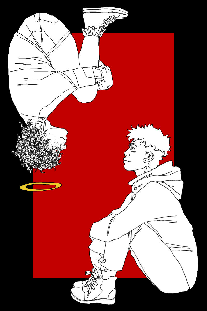 The view from the mountain Yuji stood atop was both familiar and foreign at once, reminiscent of images he had only ever witnessed printed on the pages of manga he scoured during his free time. The ancient pseudo-Japanese village he overlooked was pulled straight out of fantasies he'd had as kid and spanned far into the horizon. He had found himself lost looking out at it, for long enough to realize that it was as empty as those very dreams. For one, everything was in grayscale - like etchings on a page. Even he existed in this penciled manner. The inhabitants, tiny in the distance, did not move, as if captured in a photograph. No chatter, no wind, no birdsong. He could not hear a thing, not until he began to scale down from the rafters set up around the massive carvings of human faces along the side of the mountain. The world around him sprung to life - but for a short-lived moment, as it all came to a stop with him when he froze to look back out towards the commotion."Hello."Engel's sudden appearance at his side made him jump. He turned, alarmed, and took in the other man with some curiousity.He wore what he could call a cosplay, of the mentor of the very series the world was pulled from - a dark vest ladden with many pockets, over a long sleeved shirt, and a headband tilted at an angle that concealed one of his eyes. The emblem on the headband that typically reflected the village of origin of the characters displayed the logo of Jujutsu Tech. He seemed to be in a chipper mood, not at all concerned at this drastic change of scenery."Uh, what's going on?" Yuji asked, scratching at the back of his head. "Where are we?""You know where we are."Yuji gave a slow thoughtful nod. "I do ... sort of but ..." He paused briefly. "Where are the others?""They are where they are. What's important is your purpose here."This did nothing to quell Yuji's confusion but he tried to refocus on his surroundings. "My purpose ..." he echoed. He drew in a deep breath and resumed his climb down the rafters. The world chugged to life, clouds passing overhead. He halted his step and quickly looked back towards the village to find that, as it had before, everything had stopped abruptly when he did. There was again no sound emitting from his surroundings, an emptiness resounding within that silence. He moved again. Stop and go, stop and go. Okay, he was getting it. The world only moved with him, like turning the pages of a book. "Fighting bad guys?" he called up to Engel as the man peeked over the edge at him."Bad guys?" Engel echoed.Yuji dropped down to the platform below with a huff, alarmed by Engel when the man suddenly appeared next to him. He looked from him to the platform above and then back with a blink of confusion."What does it mean to be bad?""I dunno." Yuji said with a shrug, now taking the path along the other side of the railing towards the village. He walked with eagerness in his step, failing to mask his excitement to explore this new world around him. Still, he thought about the question. "Hurting people?""Good people hurt people sometimes, wouldn't you agree?"Yuji nodded slowly before adding, "Yeah but bad guys want to hurt people.""And good guys want to help people?" Engel was walking a couple of steps behind him.Yuji grinned, feeling like he'd solved some decades old riddle. "Yeah! So they're different."The ground tremored beneath him suddenly, making him stop in his tracks. His eyes had grown wide, darting around in their sockets for the source of the quake. Nothing seemed obvious so he took another couple of steps only to be met with a second violent shake of the earth. This time, a crack formed along the ground by his feet. He stared at it."And helping is always a good thing?" Engel continued to walk, now leaving Yuji behind. He didn't look back at him. Unlike when Yuji moved, everything around remained in the safety of the pause.Yuji slowly began to turn in time to see a massive beast peeking its head over the mountain. He rushed back towards the platforms, hoping to meet the beast on its descent down the mountain but it moved far too quickly despite its size. It was a massive foxlike creature, rabid drool hanging from its maw. Nine tails all wisped and curled behind it. Its sight was fixed on the village, Yuji a mere insect to it. The mountain broke apart with every terrifying step it took, sending debris into the air. Yuji only skidded to a halt as the beast reared to leap into the air to scale the tall protective walls of the village. And with that small gesture, the world was suspended in time yet again."Is it important that the world see you as a hero?" Engel was now standing back at his side, hands folded behind him. "Is helping always helpful?"Yuji clenched his fists at his side, the creature moving a mere centimeter at the gesture. He struggled for words, mind racing. He thought of his missions until then, of the day he impulsively swallowed Sukuna's finger and resigned himself to his fate as a vessel, to the day he witnessed Junpei's life extinguished before his eyes, to the day he drove Mr. Weon to snapping at him when confronting the Cursed Spirit in the parking garage. What was the right answer?"Turning the page when you don't know what lies in wait for you or others on the other side, it's always a gamble, isn't it? A gamble you always take.""I just-" he stopped himself when now even just moving his lips caused the beast to budge forward yet again. Frustration welled in his chest. Helping was helping, even if it was also a gamble sometimes. Had everything until then been his fault? Consequences of his own impulsiveness? It felt like that at times. As if it didn't matter what his intentions had been, it was as if though everything he ever did just made things worse.Engel circled around him, facing him. "Life comes with no warnings or disclaimers, no rewind. Any decision could change your own life or the life of another in ways we can't even fathom."Yuji exhaled before he took a s