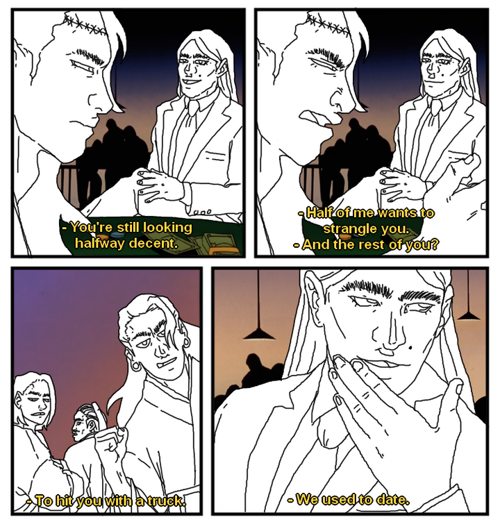 Passersby hurried down the sidewalk along the outdoor seating of a quaint newly opened cafe, eyes only ever straying from the paths in front of them to glance at the only person seated at one of the tables. Not so much because of the dress she wore that had cost her double their mortgage or even because of her loud and obnoxious phone conversation. It had more to do with the vile energy radiating from her that did nothing if not fill them with dread. The glances only ever made it as far as a peripheral glance her in her direction, too afraid to risk accidental eye contact.“I had the weirdest dream last ni- Excuse me!” Tabitha interrupted herself to stop her waiter from stepping away after bringing her drink. She pointed towards the glass with a look that would make anyone think they’d just served her rat poison. “Did I say no ice? Why isn’t there any ice in this? Remake it for me.” She gestured impatiently for the waiter to take the glass, continuing her tirade once they did. “Don’t just dump ice in it as it is, the drink’s already at room temperature and it’ll make the ice melt quicker than a chilled drink. Idiot.” She watched the server hurry away before turning back to her call.“Hello? You still there? Ok. Anyway, these new ritzy places opening up around town think they can get away with mediocre service at their prices. You give them clear instructions and they just do whatever they please. That’s not how these things work. I pay, you serve … Now, what was I saying? Oh, right! I- Hey!” Furious at a second interruption, this time by a figure she noted out of the corner of her eye reaching for the only other chair at the table aside from her own, she slammed the palm of her hand on the tabletop to grab their attention. The silverware jingled from the vibration. “Hey! You can’t just go around sitting at a stranger’s … Oh … Roger, I’ll call you back.”Click.After setting the phone down on the table before her, Tabitha leaned back into her seat and crossed her legs. She picked up a silver cigarette case from right beside where she had set down her phone, sliding a single cigarette out from within. She lit it with a lighter built into the case before setting the case back down on the table. Her movements appeared casual, careless and remiss but something about the way her eyes pierced the man now sitting before her evidenced her true feeling. Caution.“You never could do anything right, could you, Suguru?” Tabitha exhaled a cloud of smoke. “Even die.”Suguru smiled. “You haven’t changed much yourself,” he said.“That’s not true, I’ve gotten way hotter,” Tabitha corrected with a showy raise of her brows. She didn’t look at the waiter when they returned with her fresh drink and an ash tray. She did, however, pluck the drink right off the table as soon as it was set down and take a deep drink. “Now, I’m assuming you didn’t go through the trouble of hunting little ol’ me down just to join me for lunch. What do you want?” Her expression, much like her tone, could cut through a concrete block.“Would I be wrong in assuming you and I have always shared similar interests?” Suguru’s question was as poised as the way he perched himself on the seat opposite to Tabitha. Hands folded in his lap and head tilted only slightly to the side in a show of genuine intrigue.Tabitha laughed and in the same cackling tone asked, “Fucking Satoru? Killing people?”Suguru didn’t respond, only smiled.Tabitha stopped laughing, now looking annoyed. “What then?” She then pointed up to her forehead, circling her finger as if to gesture to the neat stitching across Suguru’s own forehead. “And what’s with the Franken-whatever get-up?”“You really haven’t changed,” Suguru said with a small chuckle. “Truth is, I’ve been keeping an eye on you as of late and I think we could be helpful to each other in accomplishing our goals.”Quirking a brow, Tabitha didn’t speak. She only drank and smoked, eyes never leaving Suguru.“I’ve been in contact with other allies who share the same mentality as myself and have been formulating a plan to accomplish our ultimate goal,” Suguru explained himself assuredly. “If we all cooperate, things may very well work out in our favor.”Tabitha ashed her cigarette on the floor, making no use of the ash tray brought to her by the thoughtful waiter. Now growing impatient, she said, “Well, get on with it. If you still remember anything about me, then you’d know I’ve never liked your stupid little bush beatings.” She signaled for him to go on, and to go on quickly.And go on quickly, he did. “I have a way to deal with Satoru Gojo once and for all.”Tabitha was about to take a hit off her cigarette but stopped short of the butt making contact with her lips. She was quiet, a million unspoken thoughts racing in her mind. She stared at the man sitting before her with a stone cold expression though, very well hiding the foreign sinking feeling in her chest. What was it? Not a bad feeling, just weird. Was she nervous? Unlikely.“I think with that being said you understand why I’m here.”“And you really think all this scheming and plotting of yours will work?”“I know it will.”“And you trust me?”“Oh, absolutely not.”Tabitha’s lips twinged with amusement. She took a drink from her glass, finishing off what was left and then gesturing for the waiter to fetch her a refill. “What makes you think I still harbor any resentment for Satoru? You think my pride is so frail that I’d cling to a petty high school rivalry for 20 years?”“Truthfully, yes. However, I think there are other reasons you’d want to join me. Or rather, one specific and more recently formed reason - which is why I’ve sought you out now, rather than months ago when I first started this project of mine.” When the waiter approached with Tabitha’s refill, Suguru politely requested a glass of wate