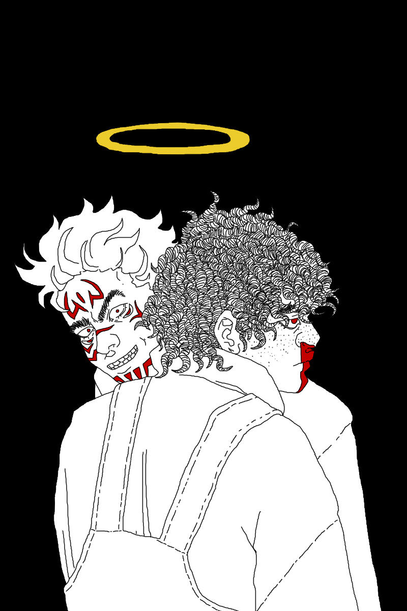 Sleep was usually difficult. Jasper always found themself too overwhelmed by the millions of fears and anxieties buzzing around in their head to doze off properly. On an average night, they'd shift and shift until their body would give out from exhaustion. But tonight. Tonight was different. There was something else keeping them wide awake, all hope for a wink of sleep gone.They were hyperaware of Yuji's arm slung around their waist; his head burrowed into the crook of their neck; his leg tossed over theirs - as if snuggling up to a teddy bear. They could hear his every breath. Slow, relaxed, not a care in the world. On occasion, he'd readjust, bringing himself closer against them. He'd fallen asleep somewhere into the 20-somethingth episode of Naruto and had been clinging to Jasper ever since. Any attempt they'd made to wiggle away was met with an aggravated groan and incoherent grumbling.It was hard for Jasper to think of reasons why this made them feel ... so weird. It wasn't an uncomfortable feeling, it was just something they'd never quite experienced before. They found themself daydreaming about holding hands with Yuji, holding him close ... Maybe even sharing a kiss. Just thinking about them all now made them want to melt into a puddle. And in the end, despite all of these foreign sensations and newly developing emotions, they didn't really want Yuji to move away. It was like getting on a scary ride at the amusement park or rolling down a hill. It was excitement they were living for once, and not fear.They had only ever shared a bed with their parents, on the many late nights they'd been woken by nightmares of the glowing red eyes they'd been burdened to coexist with. Even then, they would often just wedge themself between the two only to have their mother turn her back to them and their father accidentally give them a good elbow to the head.They glanced at Yuji, his face lit by the faint glow of their halo. Their cheeks ached."What're you looking at?"Jasper tensed.The small triangular markings on Yuji's cheekbones had split yet again, revealing two glowing red eyes. Yuji's lips had spread into a grin.Jasper said nothing, their terror keeping them frozen in place."Are you gonna answer my questions now?" At their lack of response, Sukuna resumed his pestering. "You afraid your little cuddle party's gonna come to an end if you speak? This dipshit's a pretty heavy sleeper so don't you worry about waking him.""N-No!" Jasper hissed, flustered by this sudden interrogation given their earlier thoughts. They sunk deeper into the firm mattress, acting as if they were preparing to sleep. "Will you just leave me alone? I don't like you very much." Their words were muffled as they brought their bedsheet up over their face.Sukuna laughed. "You're fuckin' rude, y'know? You should be a lot nicer, especially to me. You don't have the goods to back up the tough act. I'd crush you.""If I'm so weak, how'd you lose control of Itadori yesterday?" The words just came out, much to Jasper's shock and horror. Was it the exhaustion catching up to them? They couldn't remember the last time they'd actually slept. Maybe they were just tired of Sukuna being a generally unpleasant nuisance especially considering that their last encounter involved him shredding their face on asphalt. This wasn't good. Maybe they lucked out and he hadn't heard them through the bedsheet?The blankets were yanked from Jasper's grasp, a clawed hand grasping them around the throat and pinning them to the bed. They squirmed, fingers trying to pry the hand away.Or maybe not."Do it again then. Since you're so strong. Do it just one more time." Both of Itadori's eyes had opened but they glowed Sukuna's familiar deep bloody shade of red. Sensing their desperation made goosebumps rise on his skin. "You can't, can you? You have so much of this vile, corrupted energy flowing through you but you don't have a clue what to do with it all."Jasper's hands snapped up towards Sukuna's shoulders now, trying to push him away and alleviate the immense pressure on their neck. Their lips formed words but no sound came out. They kicked their legs out, desperate to free themself."What demented conception cooked up a creature like you? Did someone Frankenstein you to existence in a lab? Or did your harlot mother get tired of human c-"Sukuna's hold loosened as a wave of Cursed Energy burst from his target and left him disoriented."DON'T TALK ABOUT MY MOTHER!"Sukuna wavered for just long enough for Jasper to scramble out from beneath him. They practically leapt towards the foot end of the bed, heart thundering. They turned to face Sukuna, hugging their knees to their chest. Their eyes had lost their own gleaming red shade, now a solid pitch black. They trembled where they sat. Yuji's advice to flee when presented with the beast that possessed him gone from their mind.The demon knelt across the bed from them, hunched over. His hand dug into the spot where Jasper had once been. His claws tore through the plush material. His grin was spread ear to ear, eyes wide with excitement. "Is that all it takes?" he breathed. He moved closer towards the other, very slowly - like a predator stalking cornered prey. "Me mentioning your mommy?"Jasper inched back, dangerously close to the edge of the bed. Their breathing was labored, shaken by their terror. With a blink, tears fell from their eyes."I wonder just how much power is inside you," Sukuna extended a hand towards the teen. "I bet you could bring this shithole of a world to an end - but you're just an precious little baby, aren't you? You don't have a bad bone in your body. What wasted potential."Jasper couldn't move, closing their eyes tightly when they felt one of Sukuna's sharp claws graze their halo. To his surprise, it began to split as flesh would when presented with something sharp."I'll just have to make you bad.""Stop ... P-Please.""Um, hello?"The door to the room had cracked open, a pair of heads poking insid