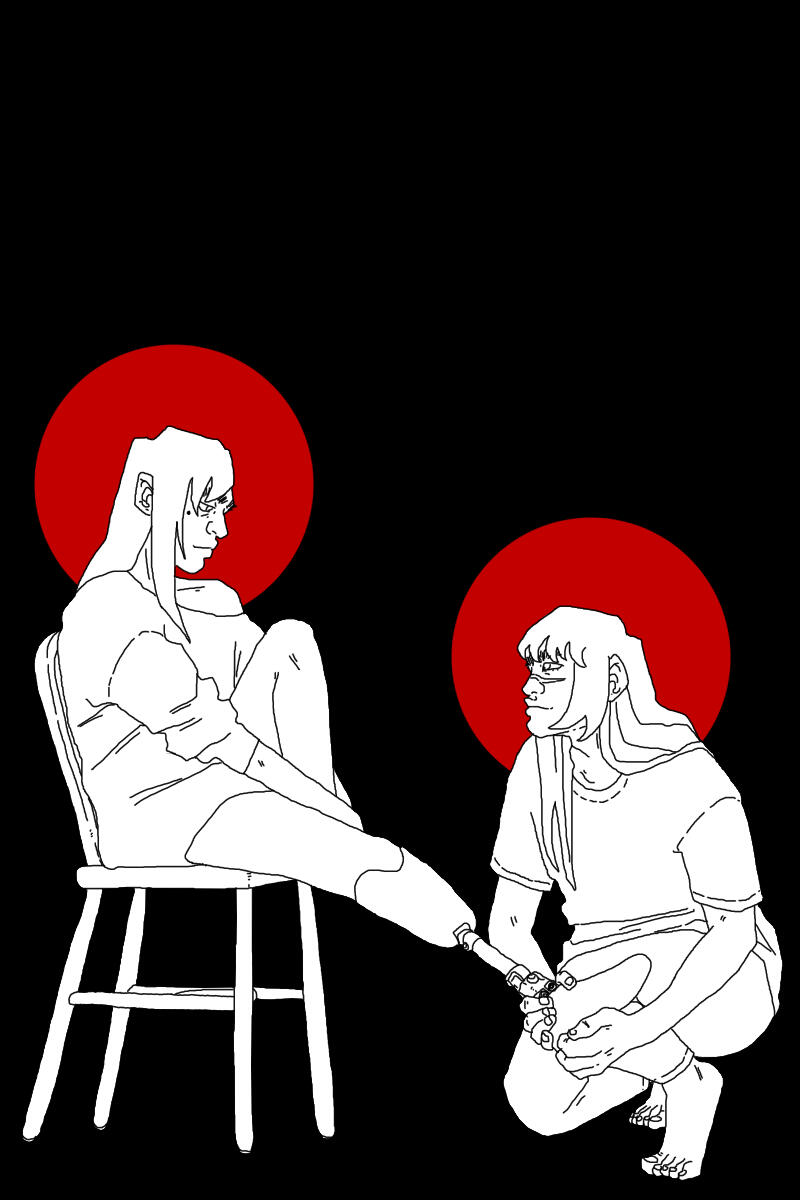 No sooner had they appeared in the main room with the others than they were sent elsewhere. In less than a blink, they were alone. The only sound in the old rotted room was that of Jasper's heavy breathing. They stood at the center of it, hugging their arms to their chest. It was the only thing they could bring themself to do. The room was bare save for them and an open window. Not even a door. How they had gotten to this particular room was beyond them. Moonlight flooded in through the window, so brightly - almost unnaturally so."H-Hello?" they managed to croak after a few deep breaths."Hello."The voice behind them made them jump. They turned, eyes wide as Engel stood before them. He was radiating a gentle white glow in the dark, his hair floating behind him as if he were underwater. "You have questions. You may ask them." His voice was so tender, so delicate. Everything about him was ... soft."Doctor ..." Their voice wavered, shaken with fear. They couldn't find the will to move, knees threatening to buckle under them. "How did you find me?""You remember me. How sweet," Engel smiled. "The last time I saw you, you were barely lucid after I wretched you back into this life you chose to waste away. You'd given up, remember? Something in you has changed it seems. Overnight, almost." He withdrew his hand from his pocket, tapping at his chin curiously. "It's rare for me to feel surprise but this ..." He paused to give the bare room a look of wonderment. "This life, this world has been so generous to me." He dropped his hand to his chest. His eyes didn't leave Jasper a single time as he spoke. They didn't think they had even seen him blink. "I apologize for my ramble. I am happy to be honored by your recollection. I am grateful for you, is what I wanted to say."Of course they remembered him. Who wouldn't? This strange elusive man. This demon. Their throat tightened and with that, they lost their speech. What could they even say? Any answers he had for them would come in riddles and they had no drive to solve them."How did I find you, you ask," he said, though they hadn't. "I argue that I never lost you. I've always known right where you were. You're an awfully difficult person to lose track of, Jasper."Jasper slowly downcast their gaze, a disappointed realization cast over them - the realization that they would never really be free of their family, of their fate."You're afraid your dear manman knows where you are? You can only assume she knows if I know."They nodded, frantic and eager as they gestured for an answer. They did not get one. At least, not the one they were looking for."Oh, ti Ja. I wish things were as simple as yes and no." He closed the space between the two in mere seconds. "I do enjoy your company ever so much," They hadn't even a moment to react before he pressed a finger to their forehead - a painful tension spreading through them as every muscle in their body contracted at the touch. A strangled cry escaped them, eyes wide with fear. "but you are not the one I wanted to speak to."Blinking rapidly as a black thick liquid began to seep from their tear ducts, it was almost as if they were fighting his will. A fight he ultimately won. They groaned, staggering back and away from him as they held their chest. They lost their sight as the liquid filled their eyes. Their halo wobbled above them, beginning to expand with a twist and a throb. Their fingers tugged at their hair, the sensation of their bones bending and rearranging inside them making vomit spout from their mouth."So dramatic," Engel mused. "Out with you.""Shut up, you geezer." As the crude words left the teen, the halo shot right down over them - a jarring twisting contorted transformation of limb and torso occuring at its center. The halo stopped inches above the ground - spiked and deformed, the entity now hovering up above it instead of the other way around. It was Jasper's mangled silhouette that stood before him but Jasper was not present. Instead there was this shadow, red eyes gleaming from within the darkness coating them. "Don't fucking touch us." A choir of voices snarled the warning.Engel chuckled, hand nestled back into his coat pocket. "How rude. This punishment was meant to make you kinder but it seems to have had the opposite effect." He tilted his head to one side. "Should I end you now and rid this child of the burden of You?"The entity rattled out a broken throated laugh. "Kill me and you end your little experiment," it growled. It began to near him, but it seemed that no matter how much they moved he was unreachable. A universe between them."This world is my experiment. You are merely a microcosm in a centuries long sequence of events. What happens to you or Jasper or anyone else for that matter, is of no consequence to me." There was a pause, his cheeky smile indicating that he wasn't yet finished. "And you, you've developed an attachment to your host - deny it as you like. I am truth. I am reality. And you can not deny me."This accusation ruffled feathers, indicated by the dripping clenching fists, but the entity refused to play into the game. Every eye on the figure was trained on Engel, keeping watch over every inch of him - narrowed with hateful suspicion. "Why did you summon us, fuckhead?""To say hello."A scoff. "We don't understand how your mind works. If you're so lonely, play with your toys but don't bother us."Engel gave an empathetic look, layered in cold condescension. "It must be so lonely, living surrounded by an innocence so foreign to you. They quite enjoy your company, and you theirs - as much as you deny it. I ask that you do what you can to protect them." His words were neither pleading nor demanding, they just were. There was a clinicality to his demeanor that cut to the very soul. "I don't particularly enjoy interfering with this illusion you all call free will but it's quite an easy task to me and I will do it if needed. Is that what you prefer?"The entity remained silent, stifl