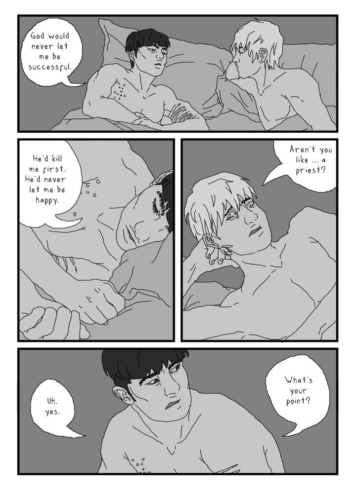 “Leaving already?”Dominic’s fingers paused only for a moment as they fastened the buttons up the front of his shirt. He glanced at Satoru’s reflection in the dresser mirror before him, but didn’t answer the question. Though the unease failed to show on his face, his fingers faltered when working their way around the buttons on the back of his clerical collar.“You need help?”At this, Dominic couldn’t suppress the small chuckle that bubbled from within him. “You did a well enough job unbuttoning it last night. Rest your hands,” he said, voice low and tone mildly sarcastic. His smile died on his lips as soon as it’d bloomed. It was too foreign a gesture for him to maintain.Satoru tilted his head as Dominic turned to face him now. The man was tall with wide shoulders and incredibly dark eyes. His hair was neatly combed and his clothes were pristine. Some would question how an outfit could spend a night in a pile on some floor without at least a piece of lint or hair caught amongst the threads the following morning, but Satoru knew Dominic well enough to know the man had been up the last couple of hours picking the specks off the black fabric painstakingly before slipping into them. As was expected of a man living hand-in-hand with his neuroticisms.“See you next Sunday?” Satoru’s tone was casual as he allowed himself to lay back into his pillows, hands folded at the back of his head. His white hair was a messy mop on his head, some strands caught on his equally snowy lashes.“God willing.” Dominic disappeared into the bathroom for a moment, returning with his work briefcase in hand. He gave Satoru a curt nod, shifting the case awkwardly back and forth between his hands. “Take care of yourself until then, Satoru.” His eyes were downcast. “I’ve been feeling unease about this coming week.”“Ah, you feel uneasy every time you gotta go. Y’just don’t wanna leave, huh?” Tone playful, Satoru did very little to hide his toothy grin. Blue eyes followed Dominic as he wordlessly made his way to the door of the studio apartment. The door creaked open. Satoru’s lips shrank into a smile. Cold.“Goodbye.”The door closed.