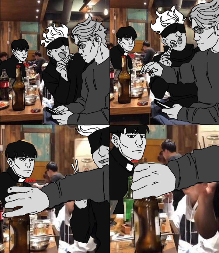 "Alright, listen up! This is the last time I'm explaining the rules so you better be paying attention if you wanna play!" Minerva's shout echoed throughout the bunker. She clutched an empty wine bottle in her hand, holding it up above her for everyone to see.From the small rocky den he'd made for himself in a far corner of the room, Jogo snorted. "As if we'd waste our time playing games," he laughed incredulously. "Like children!" He shook his head, casting a sideways glance to his one constant. Sitting near to him, Hanami had been observing the others. They didn't respond to Jogo's pedantic behavior, sitting in silence as they twirled a daisy by its stem between their fingers."This game is for the youth anyway!" Minerva shouted their way. "No one wants a bunch of old hags joining in.""Hags?!" Jogo steamed but was ignored.Minerva placed the bottle at the center of the triangle shape her, Haruta and Mahito sat in. "You're supposed to spin the bottle," she explained as she demonstrated. "And then when it stops ..." She paused as she waited for the spinning to slow. As it did, she concluded, "the two people it lands on are supposed to kiss." She visibly deflated when the tail end pointed to her and the neck at Haruta. She leaned away from the blonde. "This one was just a test!" she barked when the blonde puckered his lips at her."This is a weird game," Mahito grumbled, picking at the dirt under his nails."It's not weird," Minerva argued. "It's normal! I've seen it in movies!""I like it!" Haruta grinned.Minerva grimaced but otherwise ignored him. "I guess we could change it a bit." She took hold of the bottle again - giving it another stronger spin. As it twirled, she pondered, "How about ... whoever the two ends land on, have to spar?""What?! Why that of all things?!" Haruta whined.Mahito perked up, eyes immediately locking on the whirling bottle before him. "I like that idea way more," he grinned. Just as the bottle stopped upon Haruta and him, the door to the bunker creaked open."Minerva."Cheeks flushing with color when both Haruta and Mahito looked to her, Minerva stood at her name. She brightened up immediately upon seeing Engel descend the stairs towards them - an exaggerated performance of graciousness. "Doctor!" she called, a sickening sweetness to her tone. She gave him a curtsy as he approached her. "It's been far too long! I apologize for my absence at dinner the other night!"Mahito and Haruta exchanged odd looks."No apologies needed, my dear," Engel smiled, responding to her curtsy with a bow. "I heard you experienced quite a fright last week." Spindly fingers reached out to her, pressed to her cheek, drew her nearer to him with the warmth of his touch. "I heard you were suffering through the most dreadful fever." He smiled tenderly at her as she nervously dropped her gaze. "I'd like-""I was the one that saved her, by the way!" Mahito interrupted, forcing himself between the two. "It was me.""Mahito!" Minerva scolded, yanking him away from the doctor. "Please, excuse him! He's not exactly housebroken yet!"Engel chuckled, "It's alright. I quite like unbroken things." He eyed a curious Mahito with a callous scrutiny, before he turned - now walking towards one of the many doors lining the walls of the underground shelter. His path informed them that he knew well the direction he was headed in. "I'd like to give you a check-up and make sure you've healed up well. It won't take long. I need to be back at the school in time for lunch." He didn't look back as he spoke. "Your friends can come along for your appointment - as long as you keep them under control. It shouldn't be too hard a task for you."With a purposeful nod, Minerva took both Haruta and Mahito's hands and squeezed - dragging them along after her.Jogo watched them leave with suspicion in his gaze before glancing towards the now-abandoned bottle. A snort left him when he noticed it pointed between him and the stairs.